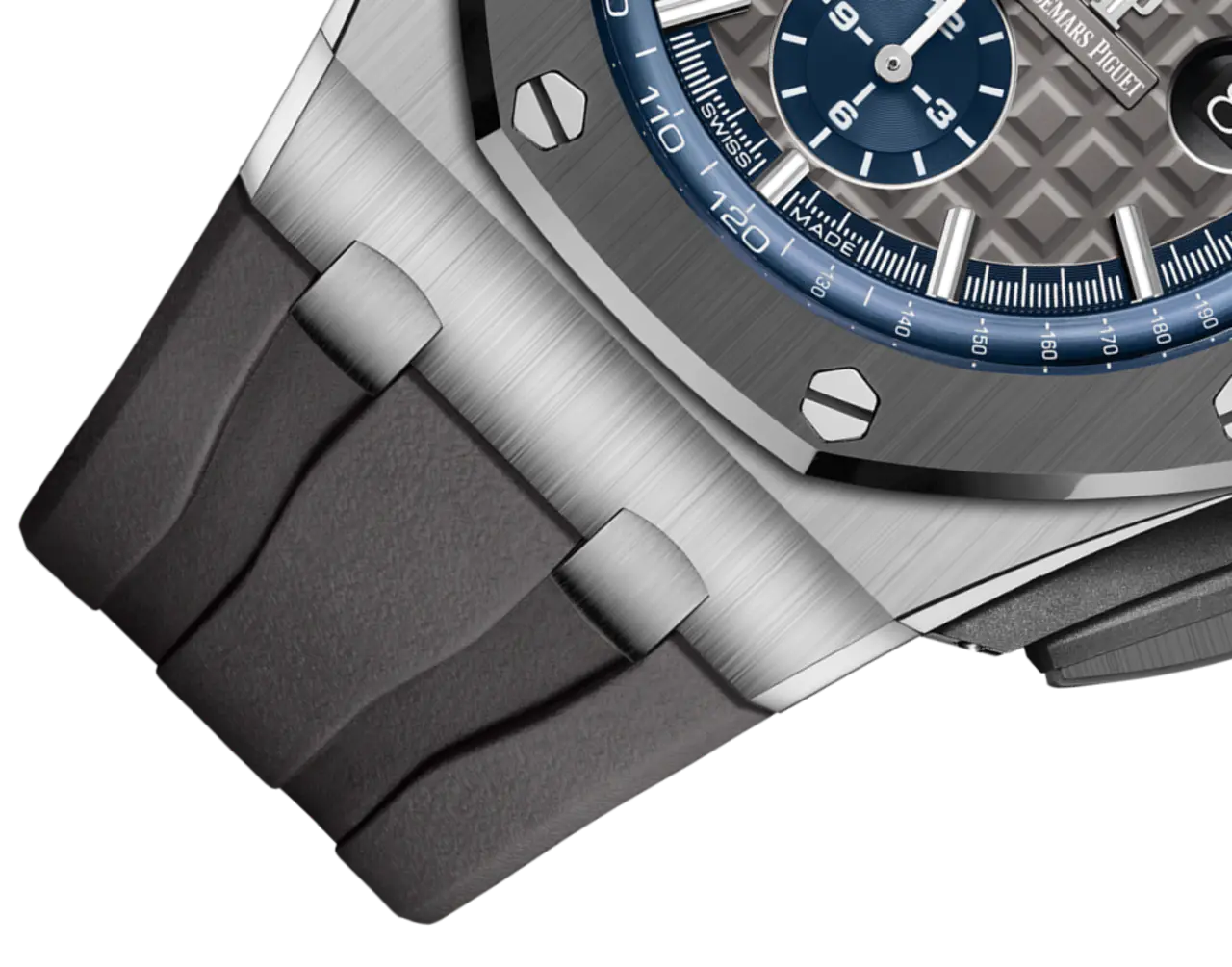 Grey dial with “Mega Tapisserie” pattern, blue counters and blue external zone, white gold applied hour-markers and Royal Oak hands with luminescent coating, blue inner bezel.