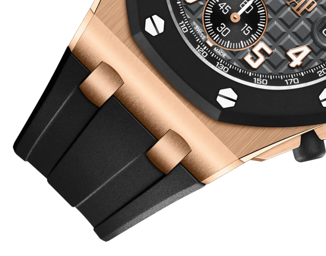Black rubber strap with 18-carat pink gold AP pin buckle and interchangeable strap system. Additional black calfskin strap.
